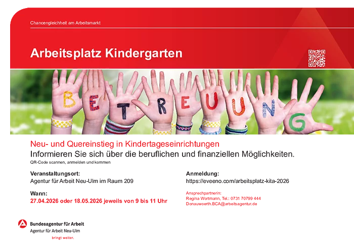 Quereinstieg KiTa – Deine Chance! Regina Wortmann, die Beauftragte für Chancengleichheit der Agentur für Arbeit Neu-Ulm, bietet zum Thema „Weiterbildung oder Quereinstieg in Kindertageseinrichtungen“ eine kostenlose Veranstaltung an.   Sie findet am 27. April 2026 oder alternativ am 18. Mai 2026 jeweils von 09:00 bis 11:00 Uhr in der Agentur für Arbeit Neu-Ulm, Reuttierstr. 39 statt.    Wer an einem Karrierewechsel interessiert ist oder sich beruflich im Bereich der frühkindlichen Bildung…